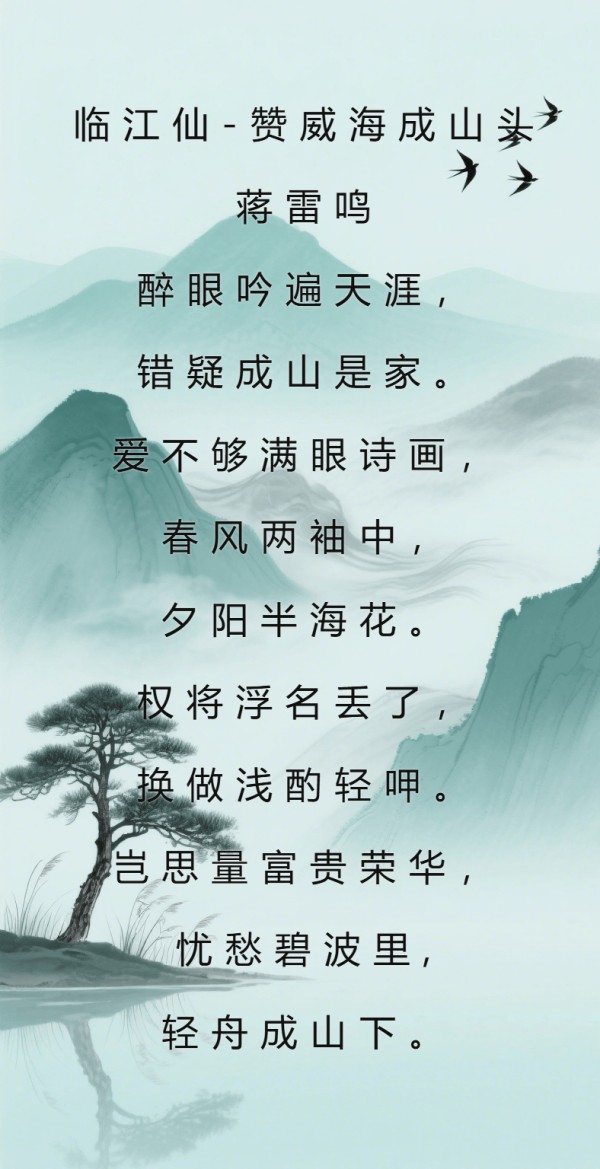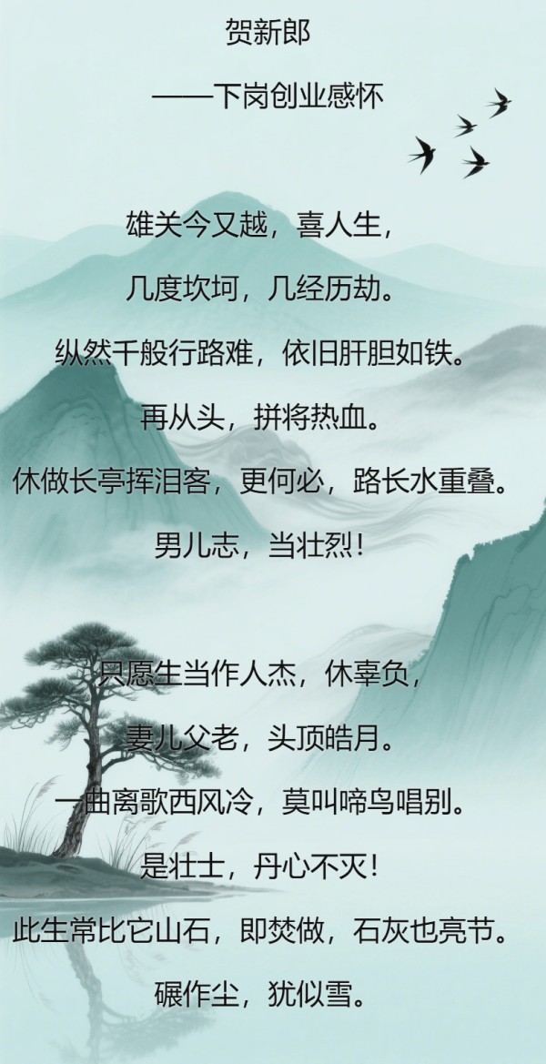 综上所述,《贺新郎・下岗创业感怀》是一篇豪壮与深情兼具的词牌佳作,蒋雷鸣老师以困境为纸、以壮志为笔,既写尽下岗创业的坚韧突围,更抒出男儿的品格风骨,既见豪放词的气场,更显人生的重量。