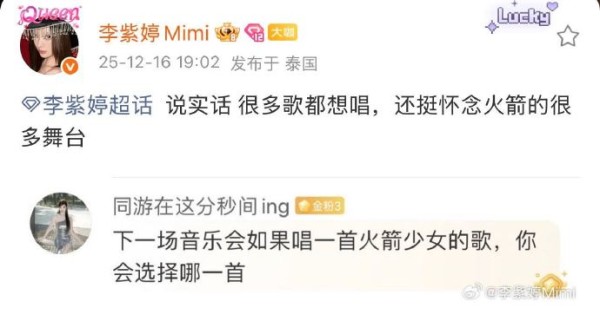 #李紫婷想念火箭少女的舞台# 昨晚@李紫婷Mimi 空降超话回答粉丝提问,面对想听火箭少女的歌的粉丝,李紫婷回复表示会怀念火箭的舞台。原来会留恋过去的不只有粉丝!