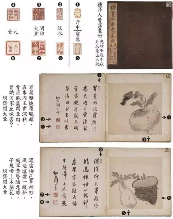 《种芹人曹沾画册》上不仅有曹沾题诗“冷雨寒烟卧碧尘,秋田蔓底摘来新。披图空羡东门味,渴死许多烦热人”,还有八幅勾画芋头、萝卜、茄子、西瓜、海棠、残荷、峭石灵芝、渔翁的着色画。对我们了解曹雪芹的思想、曹雪芹的绘画及书法,以及日常交往等情况提供了重要参考。