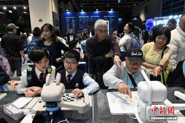 图为展览现场,长者们(右)与AI机器人进行中国象棋对弈,学生们与AI机器人进行国际象棋对弈。中新网记者 李志华 摄