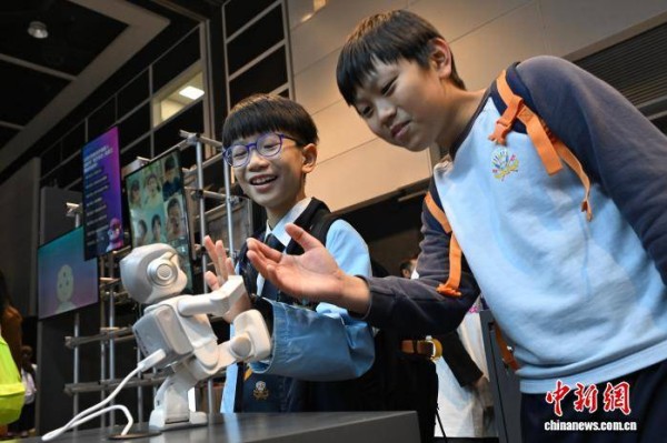 图为学生们与机器人互动。中新网记者 李志华 摄