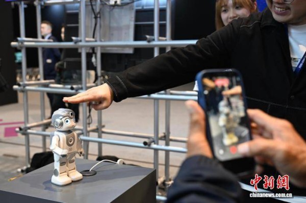 图为现场人士与智能教育机器人互动。中新网记者 李志华 摄