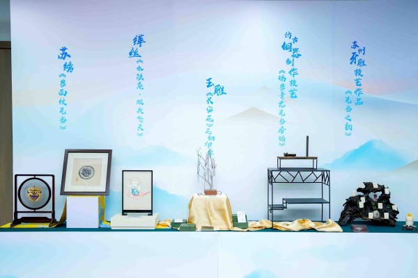 首发仪式上,姑苏区以丝绸之路、汉唐文化为主题,重点打造“一带一路”主题项目,运用苏州匠人非遗技艺,融合陕西多地代表性元素,重点推出了缂丝作品《水陆庵•双头飞天》、苏绣作品《兽面纹瓦当》、牙雕作品《瓦当之韵》、苏州仿古铜器制作技艺作品《瑞兽青龙瓦当香插》、玉雕作品《长安花》花钿印章等多项非遗作品及文创产品。