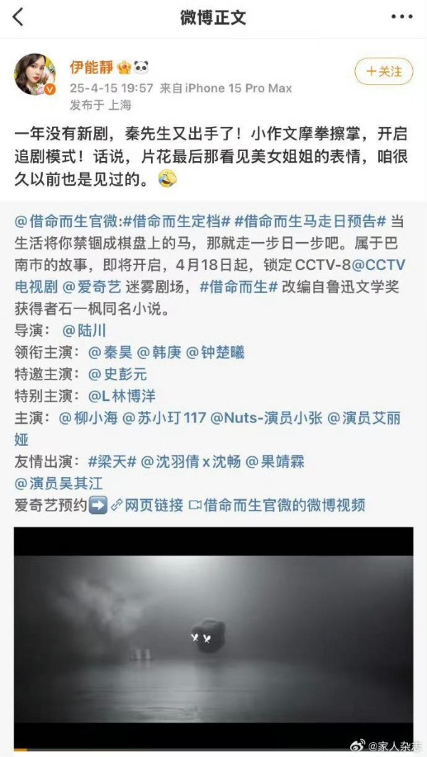伊能静为秦昊新剧《借命而生》打call…