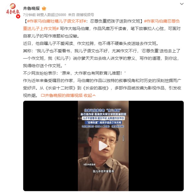 近日,他自曝儿子不爱阅读、作文拉胯,他不得不硬着头皮送娃去作文班。