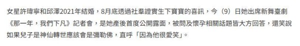 许玮甯和邱泽在2021年结婚,因为是闪婚,一直不被看好,两人上个月宣布第一胎儿子出生,而其实许玮甯早就产下儿子两三个月了。她还表示邱泽变了,以前比较务实,有了儿子后,梦幻的那点出来了,想帮儿子创造一个梦幻的世界,不管说是卡通还是什么,他希望不破灭,让儿子相信世界是美好的。