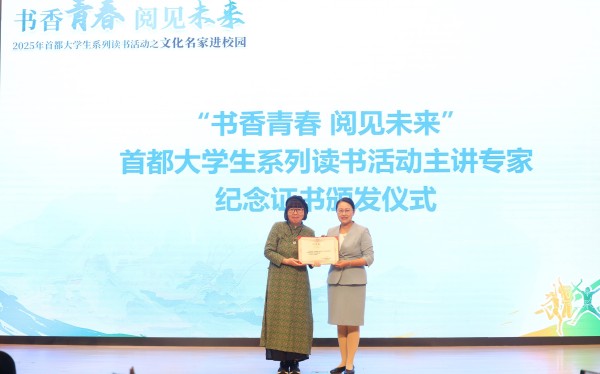 这是由北京市委教育工委主办,新京报社、北京语言大学承办的“书香青春 阅见未来”2025年首都大学生系列读书活动之文化名家进校园活动现场,乔叶带来了“在写作中成长”的主题分享。