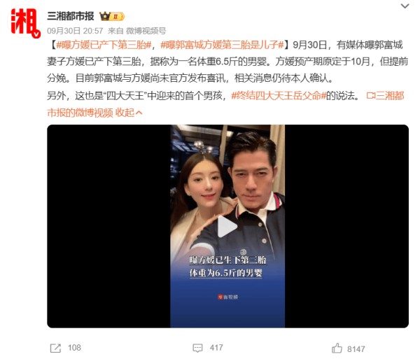 9月30日,有媒体曝郭富城妻子方媛已产下第三胎,据称为一名体重6.5斤的男婴。方媛预产期原定于10月,但提前分娩。目前郭富城与方媛尚未官方发布喜讯,相关消息仍待本人确认。