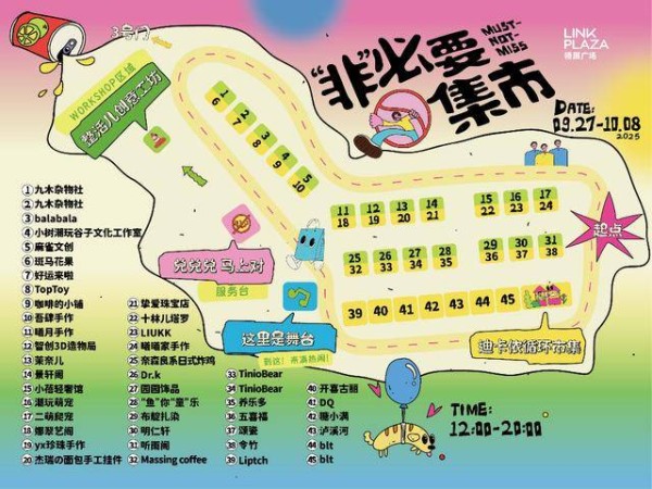 本次市集汇聚43家特色摊位,涵盖文创手作、二次元周边、绿色循环、特色美食等多个领域。麻雀文创、吾肆手作、BLT微醺实验室等品牌齐聚,形成“烟火寻迹”“次元岛集”“巧匠造物”“灵感补给”四大主题区域,搭配迪卡侬循环市集。