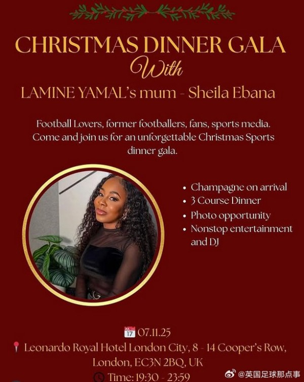 【有想去的吗?】马卡报:亚马尔的母亲希拉·埃巴纳 (Sheila Ebana) 为球迷们提供了在11月7日与她见面的机会,但价格不菲……• 150欧元:欢迎鸡尾酒 + 三道式晚宴• 400欧元:无限量特选饮品 + 三道式晚宴• 800欧元:贵宾席 + 无限量饮品 + 与亚马尔母亲的合影机会活动宣传语为:“切勿错过见到世界最佳球员之一的母亲的机会!” 目标招募400人,年龄要求18岁以上。据悉,亚马尔本人不会出席晚宴。