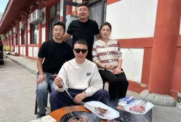 孙红雷和老婆王骏迪到宁夏旅游。在院子烤羊肉串,打扮时尚好贵气