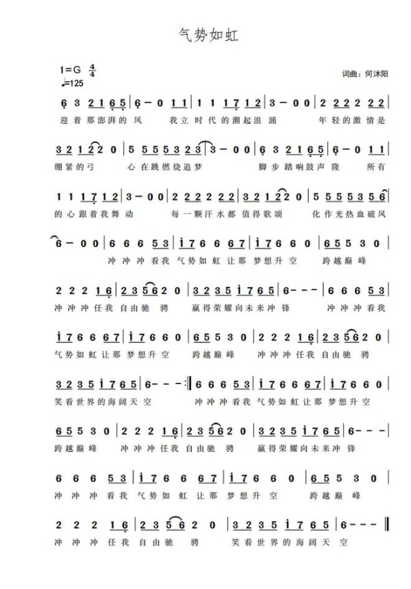 《气势如虹》的创作立足全运会首次由粤港澳三地承办这一背景,紧扣“体育精神与时代精神融合”的主题。开篇一句“迎着那澎湃的风,我立时代的潮起浪涌”,融汇自然盛景和时代气象,寓意体育健儿的奋进姿态。“年轻的激情是绷紧的弓”、“热血破风”等歌词,进一步强化运动健儿蓄势待发、拼搏进取的群像;而“所有的心跟着我舞动”,则升华至全民参与、同心筑梦的情感维度。