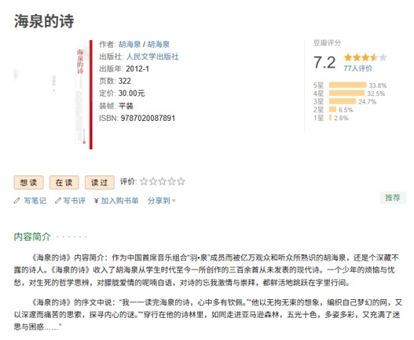 公开资料显示,《海泉的诗》是音乐人胡海泉创作的诗集,由人民文学出版社于2012年1月出版。作者出生于军旅诗人家庭,11岁起发表文学作品,该书收录其13至19岁期间创作的三百余首未公开现代诗,展现其学生时代的文学轨迹。