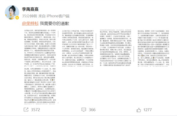 李禹熹发文控诉荣梓杉出轨打人:我需要你的道歉