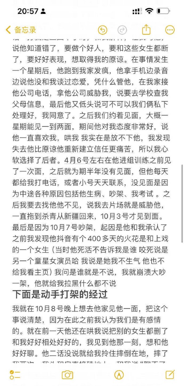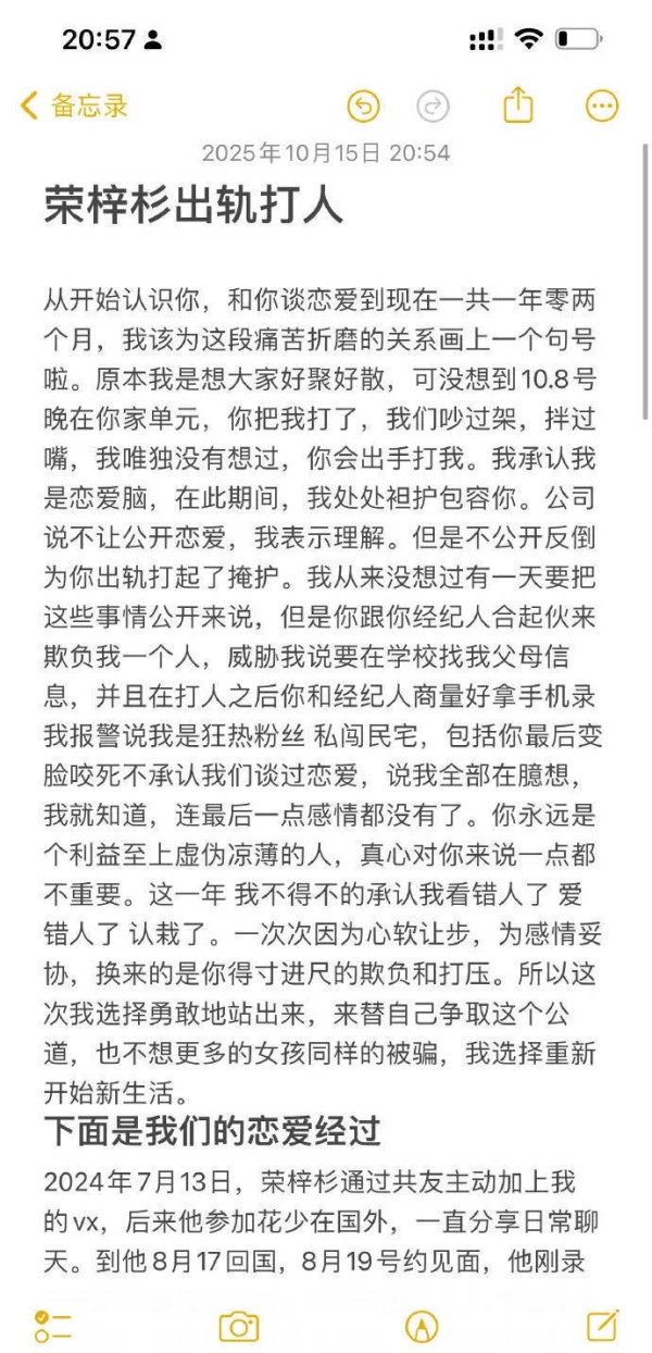10月15日,演员李禹熹通过社交媒体发布长文,公开喊话荣梓杉并要求其道歉。她在文中详细叙述了两人之间的情感经历:确认恋爱关系三个月后,男方开始采取冷暴力态度,且在交往期间同时与多名女性保持暧昧联系。这种持续的情感伤害导致李禹熹一度被确诊为中度焦虑和抑郁。