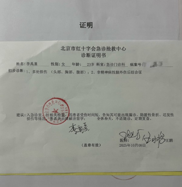 此外,李禹熹在文中还提及了荣梓杉曾对她动手的情况。为佐证自己的身心健康受到严重影响,她随文附上了相关的诊断证明。