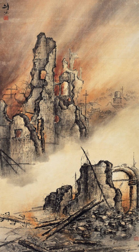 在此次展览中,观众可以看到高剑父中国画《东战场的烈焰》,该作原题《淞沪浩劫》,描绘了1932 年“一·二八淞沪抗战”中遭到日军炮火轰炸的上海闸北的“写真画”。“高剑父这件作品的构图方式和视觉张力,以具有遥深感的视觉元素,赋予图像以更丰富的信息量和想象力。”