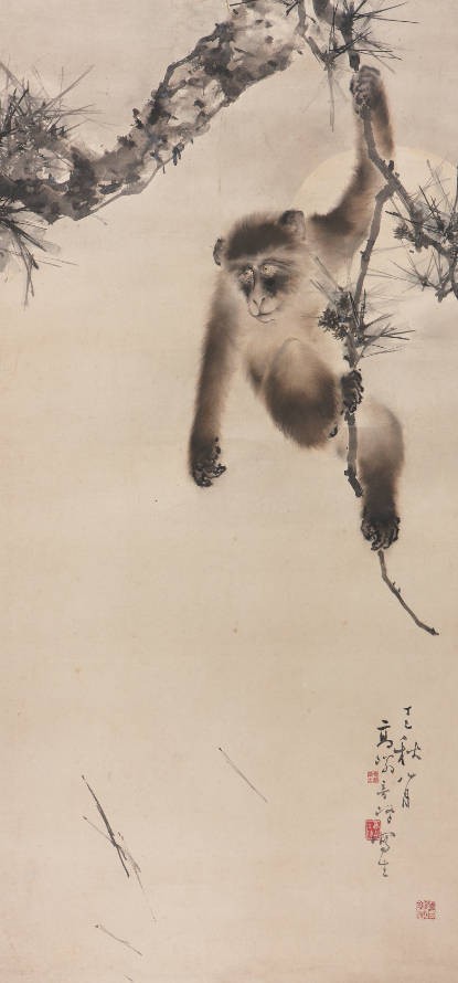 高奇峰《松猿图》,画面中一猿猴吊挂松枝,刻画精微,形神逼真。“这件画作既有西方透视技法的特点,也可见深厚的中国传统绘画功底,堪称高氏绘画精品与代表佳作。”