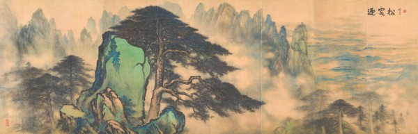 黎雄才一生写生画有一万多幅,其中2000多幅是松树。《迎客松》则是他最大的一张画,长约11米。画面远景为峻秀群峰,飘渺的云雾萦绕其间;近景迎客松遒劲恣肆,有着强烈的艺术感染力与震撼力。