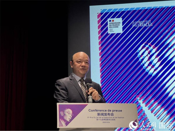 10月16日,法国驻华大使馆文化、教育与科学事务公使衔参赞艾文鸿在第十七届傅雷翻译出版奖新闻发布会上致辞。人民网 谢莹摄