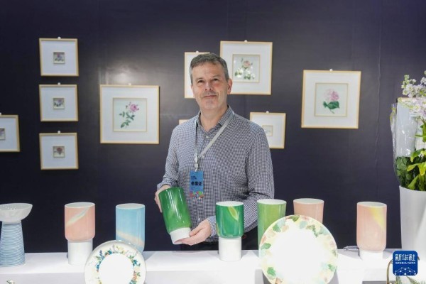 10月17日,来自英国的参展商在中外交流互鉴馆展示一款瓷器。