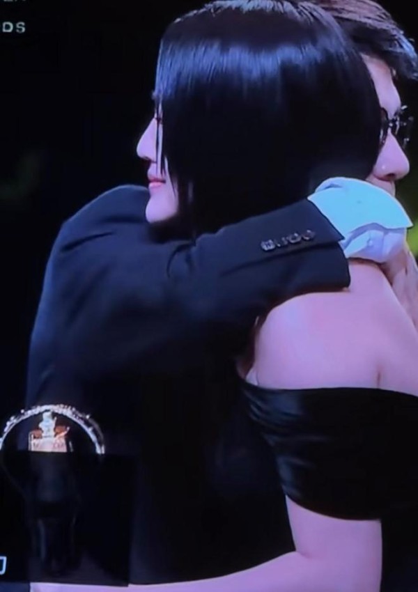 拿到奖杯后,二人深深相拥,此画面无比感人。