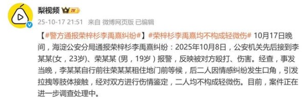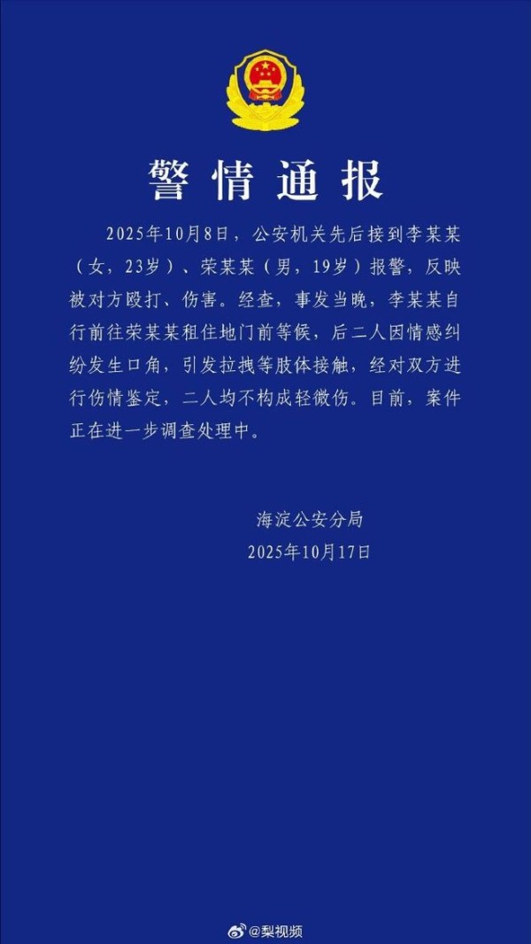 一纸警方通报,直接掀翻了娱乐圈声明的“牌桌”。10月17日晚,海淀公安分局针对演员荣梓杉(19岁)与李禹熹(23岁)的纠纷发布通报,不仅确认双方因“情感纠纷”发生冲突,更让荣梓杉工作室此前“从未恋爱”的声明彻底沦为笑柄,被网友调侃为“警方官宣恋情第一人”。