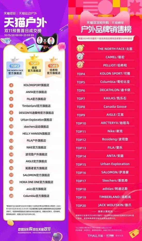此外,在今年天猫双11运动户外首日销售榜单中,本土品牌骆驼超越The North Face位列第一,伯希和保持第三,而始祖鸟则跌出前十,未进入前二十名。