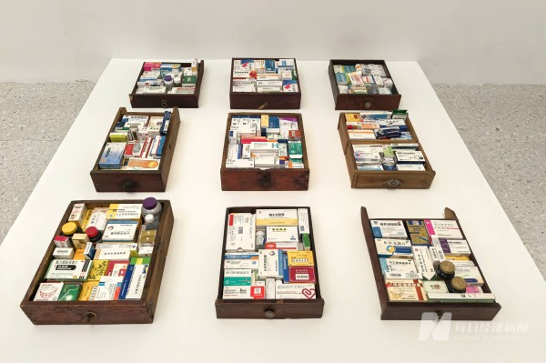 景军x周雯静,《给自己开药方》,2025,抽屉,常用药盒,46×38×12厘米每组,共9组。图片来源:每经记者 谢陶 摄