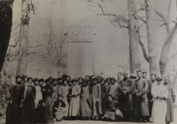 1934年春,北仓女中春游于曲阜孔林合影。前排右三马戢武,右二谢瑞阶。