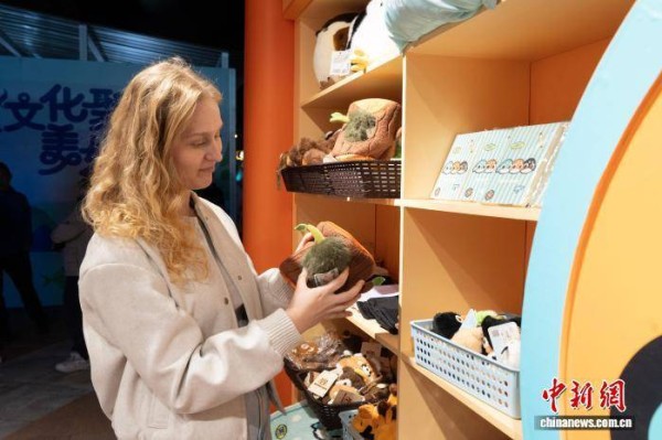 10月23日,一名外籍人士选购千岛湖特色文创。中新社记者 吴君毅 摄