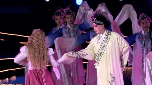 晚会以“十年文明互鉴路,牡丹新声世界听”为主题,也着力呈现了东西方文化的情感共鸣。由昆曲名家柯军与英国导演Leon Rubin联合创排的戏剧《汤莎会》,让《牡丹亭》和《罗密欧与朱丽叶》同台相遇,展现东方“至情”与西方“挚爱”的精神契合;《友谊地久天长》由多国艺术家联袂演唱,传递跨越地域的真诚情谊;歌剧《今夜无人入睡》以磅礴声线将现场气氛推向高潮;戏曲创演《百戏芳华》融合锣鼓经与昆腔,展现中国戏曲丰富的舞台语汇;晚会尾声,中英歌手与台上演员共同唱响主题曲《我在牡丹亭等你》,以艺术为桥,寄望文明互鉴、心灵相通的未来愿景。