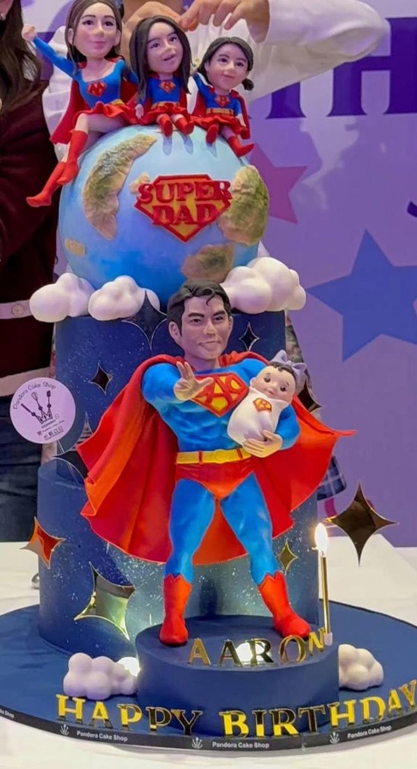 这个蛋糕做得也是很棒,郭天王变身超人,单手抱宝宝,妈妈方媛带着两个女儿坐在爸爸身后,这也是满满的爱意。他们是超人家庭,很可爱。