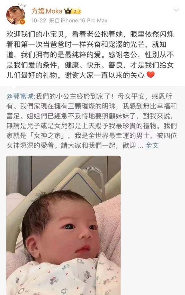 方媛转发老公官宣第三胎宝宝出生的消息,因为之前大家一直在猜测这一定是个男宝宝,因为已经生了第三个了。郭富城表示无论儿子或是女儿都是上天赐给他最珍贵的礼物,他们家是女神之家,他是全世界最幸运的男士,被四位女神深深的爱着。郭富城一定真的喜欢孩子,不管是男孩还是女孩,其实如果真要生儿子,可能会有技术干预,但郭富城没有。