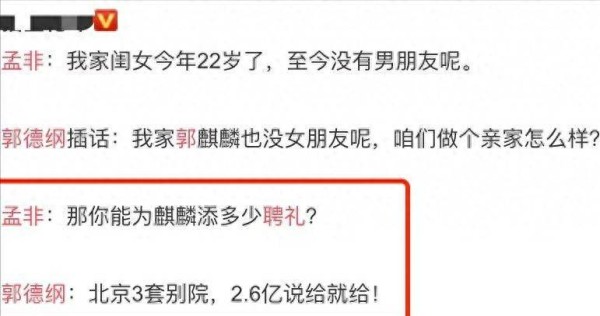 郭德纲和孟非坐在一起聊天,聊到孩子结婚的话题,现场氛围立刻热了起来。郭德纲话匣子一开,提到自己在北京买了三套四合院,现金珠宝车子应有尽有,甚至彩礼高达2.6亿,直接摆在桌面上,孟非听得连忙摆手表示不敢接受。他说这些事还是让孩子们自己决定,台下的观众听得都笑了。