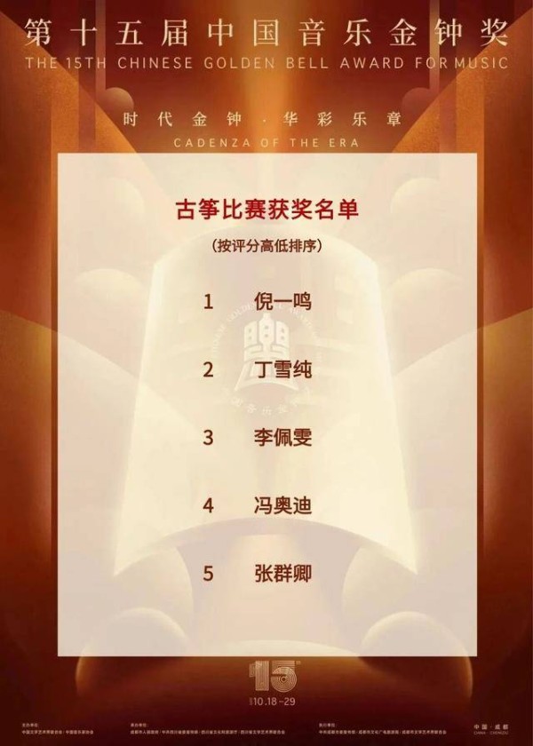 10月25日至26日,第十五届中国音乐金钟奖管乐(铜管)比赛决赛、民族弹拨乐比赛决赛、古筝比赛决赛和声乐(美声)比赛决赛圆满结束。来自四川音乐学院的夏德奇荣获声乐(美声)决赛第三名、冯奥迪荣获古筝决赛第四名。