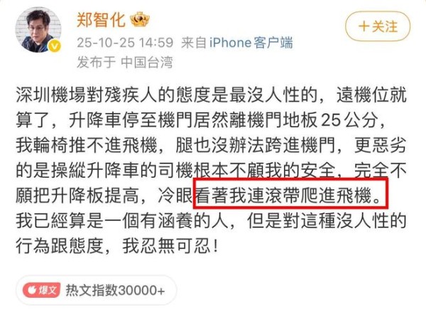 但是帖子里的郑智化吐槽国内多个机场安检程序繁琐,隐晦的表示他作为残疾人受到了区别对待。