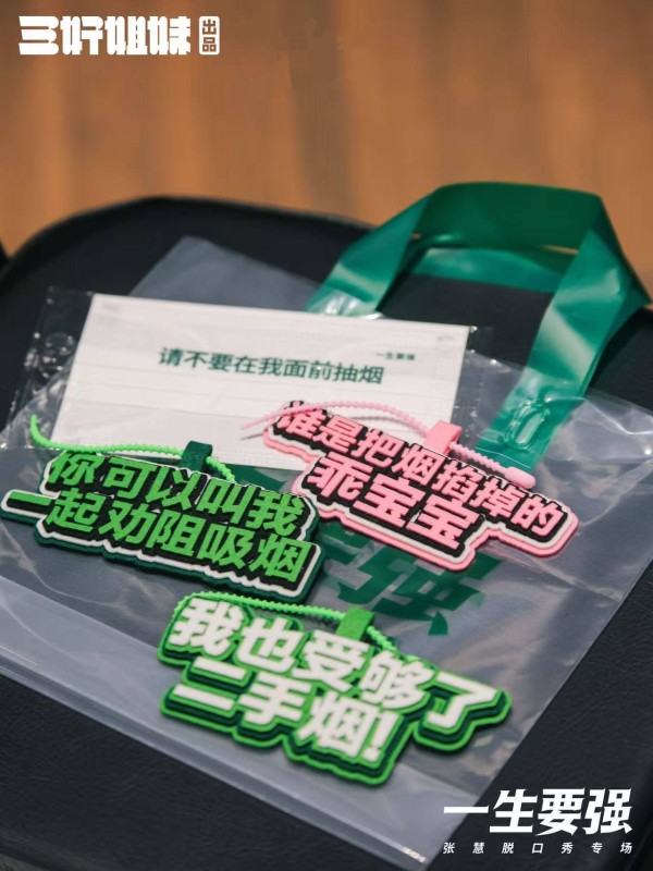 此次专场的一大亮点,是与中国青年网联手打造的控烟公益环节。张慧团队为专场定制了印制劝阻吸烟标语的挂件、禁烟主题口罩周边。