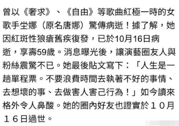 台湾女歌手坣娜病逝享年59岁 金曲《奢求》已成永恒记忆