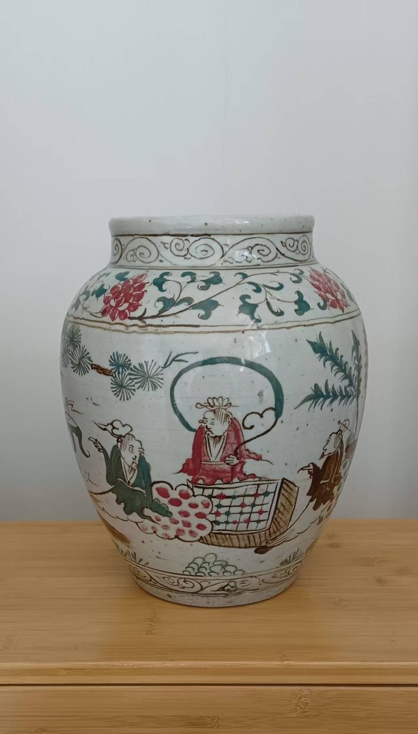 - **艺术审美价值**:明代五彩的“浓艳色彩”与“繁密纹饰”代表了当时民间瓷艺的审美取向,这件对弈罐的纹饰布局、色彩搭配、人物塑造都展现了明代民窑工匠的艺术造诣,是民间瓷艺收藏的重要标本。
