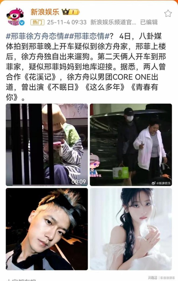 有狗仔拍到邢菲晚上开车去男演员徐方舟家过夜,邢菲先上楼后,然后徐方舟又独自出来遛狗。看来交往时间已经久了。