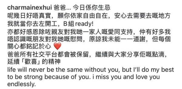 对于许恵菁来说,她往后再也不能与许绍雄一起庆祝生日了,想到这里也不禁悲从心来。不过许恵菁能够在社交平台上发文,说明她已经调整好了心情,也要重新振作起来。许恵菁名义上是在为许绍雄的生忌说些什么,实际上也是借由这一天抒发自己的心情。她称这几天一直过得好不真实,只能安慰自己,父亲去了工作了,不在身边,并且希望许绍雄自由自在,安心去想要去的地方。此外,她还感谢亲友以及不认识的朋友对他们全家的问候,未能一一道谢却都铭记于心。最后她还宣布许绍雄生前所有的社交平台都会被保留,继续分享许绍雄的点滴,让他的精神延续。
