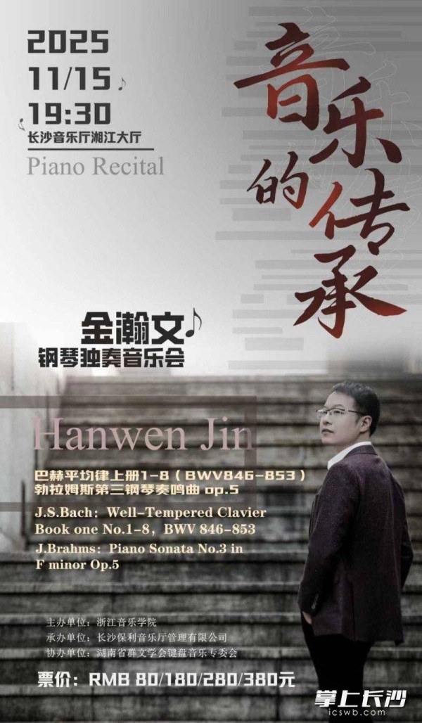这场音乐会,因而超越了普通的演出范畴。它既是金瀚文本人对从巴赫到勃拉姆斯这一伟大音乐传统的致敬与诠释,也是他与他的教学团队——包括家人与学生——共同展示艺术传承成果的舞台。本场音乐会由浙江音乐学院主办,长沙保利音乐厅管理有限公司承办,湖南省群文学会键盘音乐专业委员会协办。11月15日的长沙音乐厅,必将成为感受经典魅力、见证音乐薪火相传的动人夜晚。