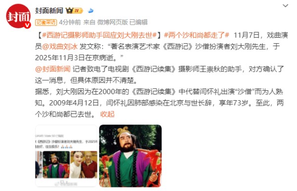 11月7日,戏曲演员刘冰发文称:“著名表演艺术家《西游记》沙僧扮演者刘大刚先生,于2025年11月3日在京病逝。”