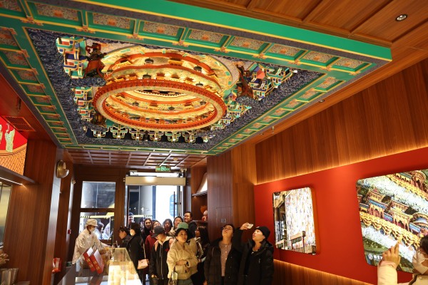 “隆福寺的这块‘天宫藻井’精美绝伦,现在已经成为北京的一项标志性文物,相关文创产品也深受年轻人们喜爱。在园区和店铺的装饰中,也大量使用了藻井的相关元素。”在一家特色糕点店中,解说员指着天花板上的仿制“天宫藻井”说道。