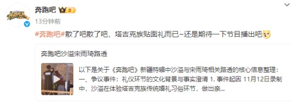 11月12日,有网友晒出综艺《奔跑吧》录制的路透。视频中,沙溢疑似亲吻了宋雨琦,引发网友热议。随后,《奔跑吧》节目组官方账号发文回应:“散了吧散了吧,塔吉克族贴面礼而已~还是期待一下节目播出吧。”
