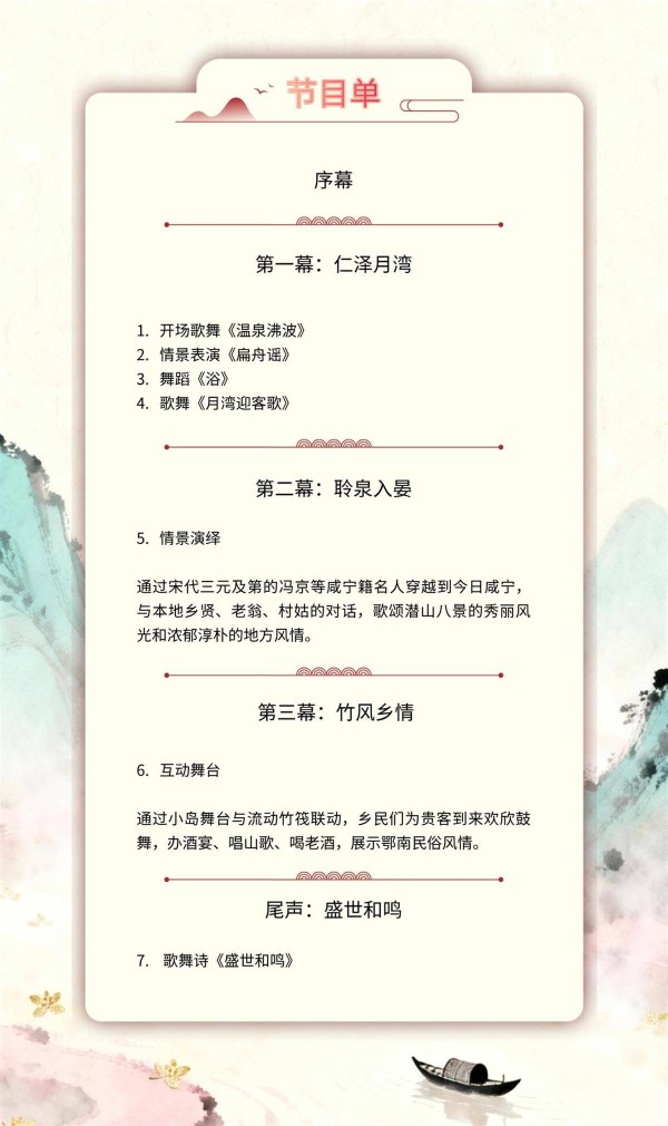 据悉,整场演出以咸宁的温泉文化与历史传说为脉络精心编排。开场歌舞《温泉沸波》将以沸腾的热情迎接来宾,随后,观众将跟随扁舟少女的视角,依次欣赏展现少女沐浴时婀娜多姿的古典舞《浴》,在《月湾迎客歌》中体验乡民手捧桂花酒迎客的淳朴风情,并“邂逅”冯京、苏轼等与咸宁结缘的历史名仕,共赏潜山胜景。