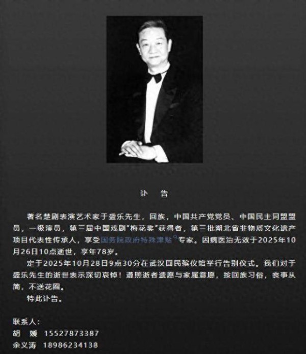 就在大家还在为近期文坛巨擘的离去而感怀时,文艺圈再传悲讯!楚剧界的“顶梁柱”、国家级非遗传承人于盛乐老先生,于10月26日因病辞世,享年78岁。这位被誉为“楚剧天花板”的老艺术家,将他的一生都献给了舞台。