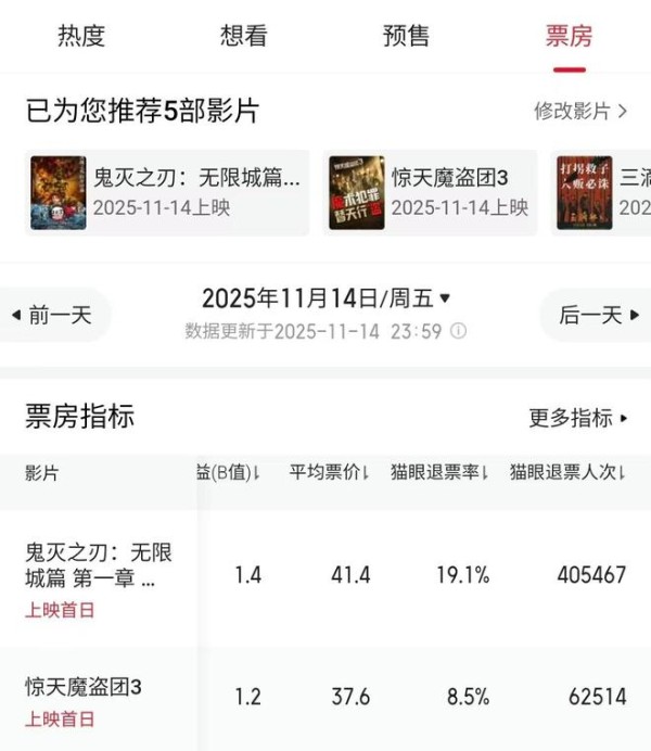 这样的一种表现确实是很出色,不过让人感到意外且震惊的是,这两天《鬼灭之刃 无限城篇 第一章》的退票率也非常高,直逼20%。也就是说,在100个人当中,就有将近20个人集体退票。