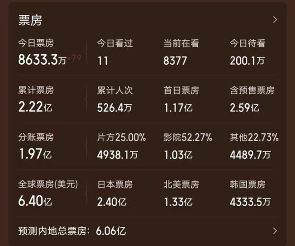 日本的《鬼灭之刃 无限城篇 第一章》堪称《哪吒2》之后,全球年度最火热的动画电影,该片在日本本土实现了超级大爆,累计票房2.4亿美元,成功超越了《千与千寻》,拿下了日本影史票房榜亚军的位置。在登陆北美市场后,《鬼灭之刃 无限城篇 第一章》的表现也是非常出色,曾连续近半月时间登顶日冠,现在共收获了1.33亿美元,《哪吒2》都不如它的一个零头。再算上海外其它市场,《鬼灭之刃 无限城篇 第一章》目前的全球累计总票房已经达到了6.4亿美元,轻松打破了日本电影的全球最高票房纪录。
